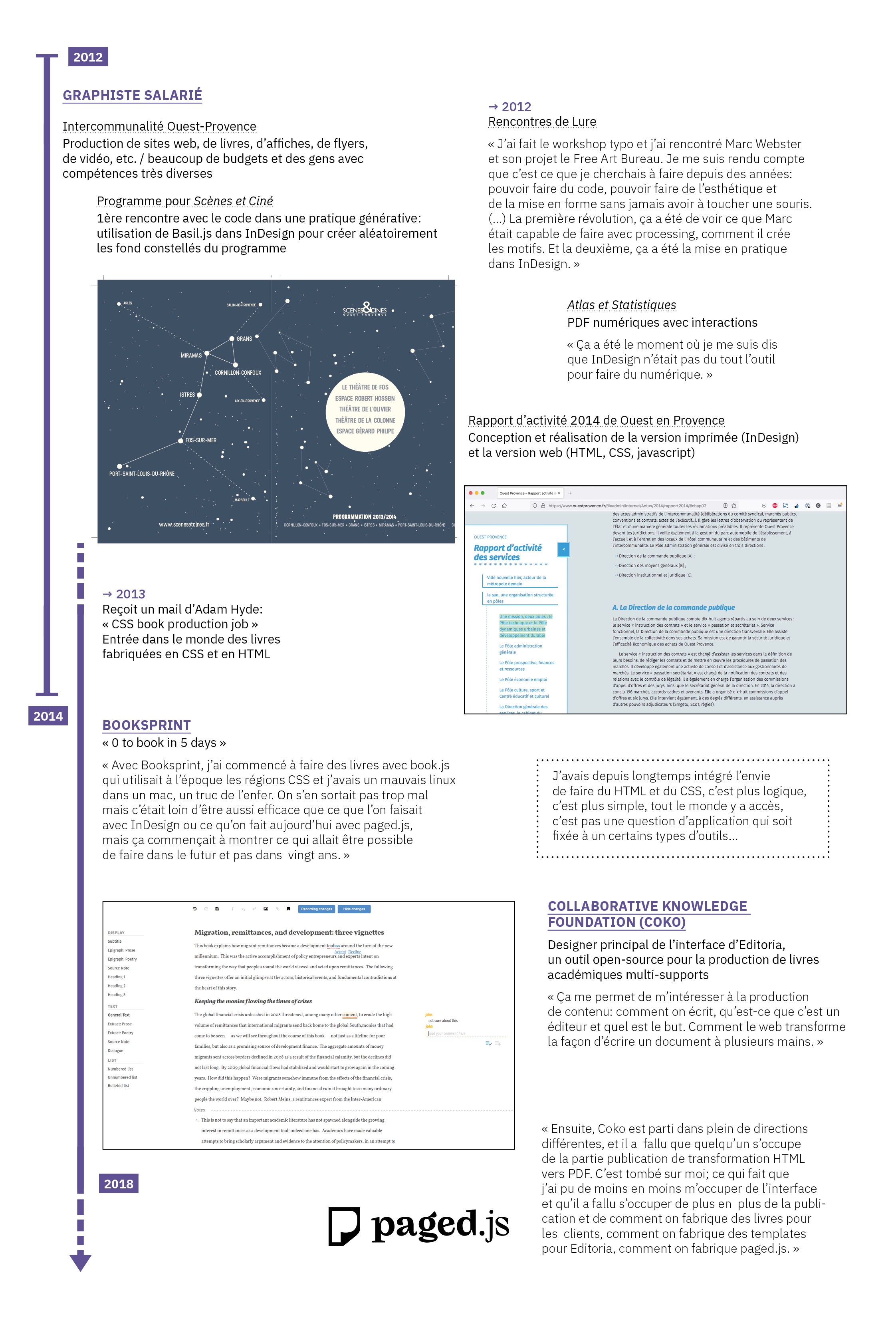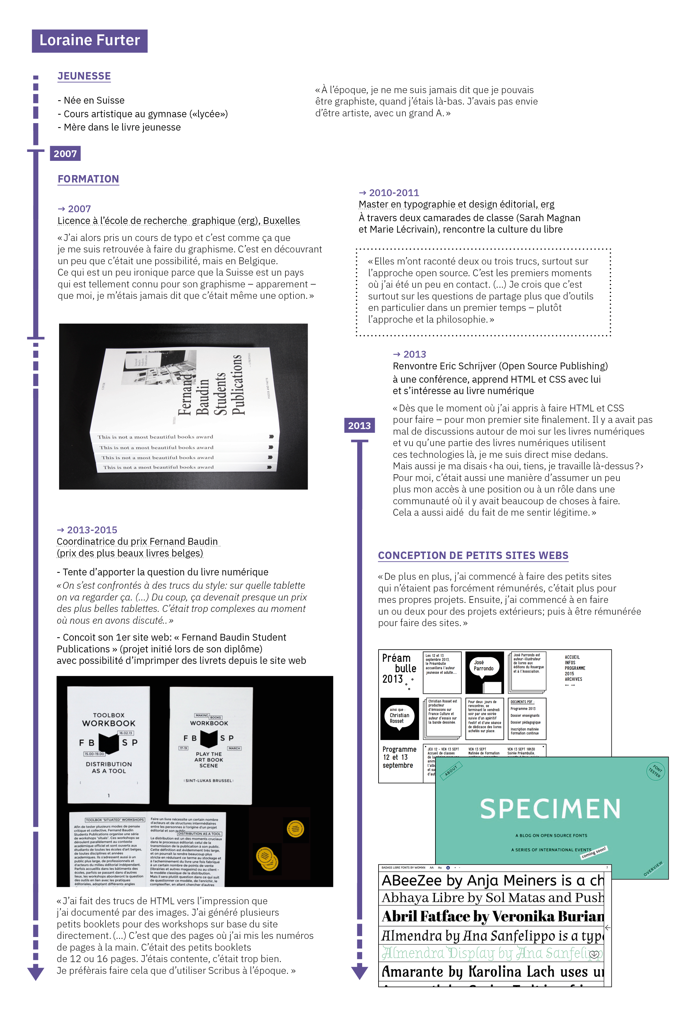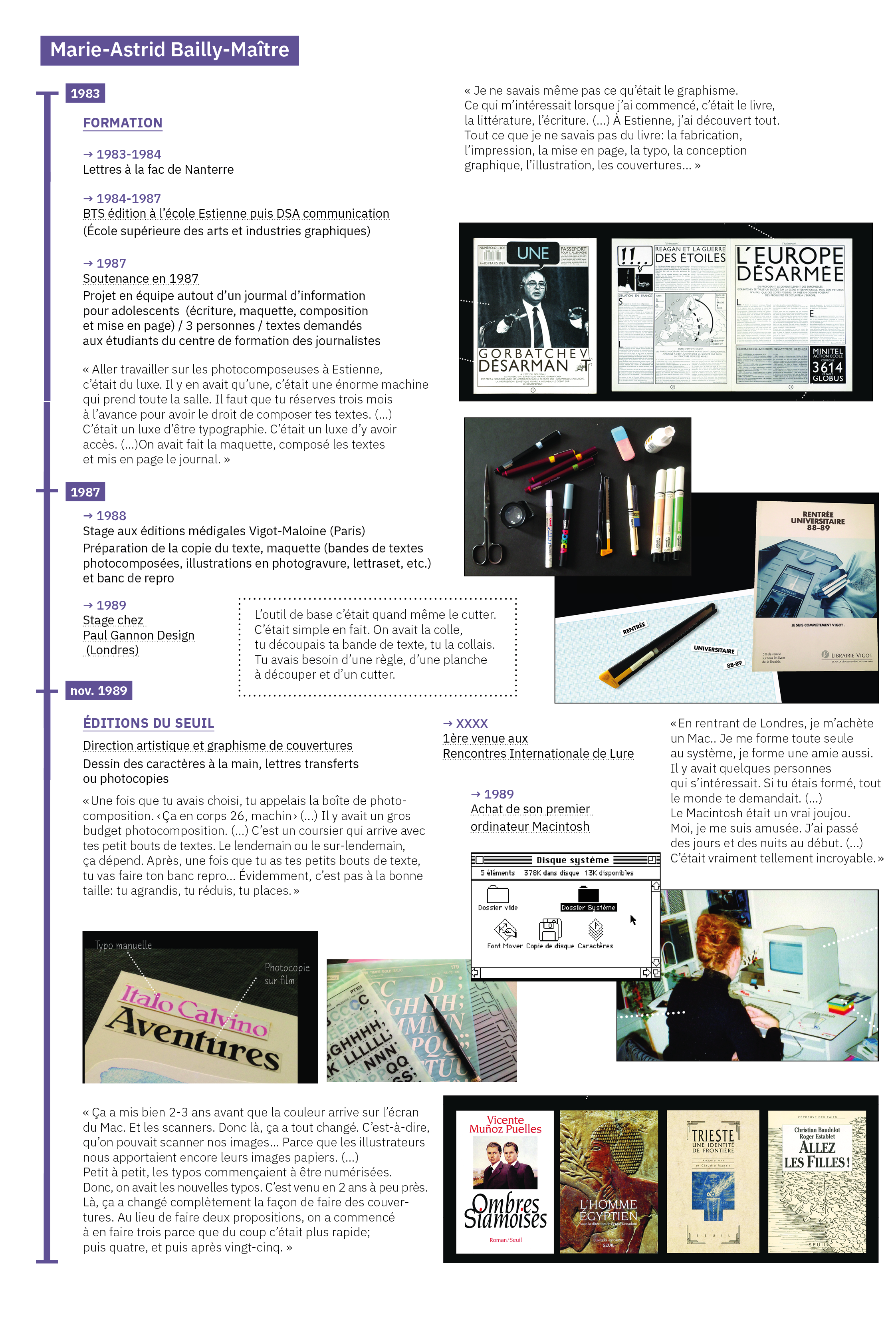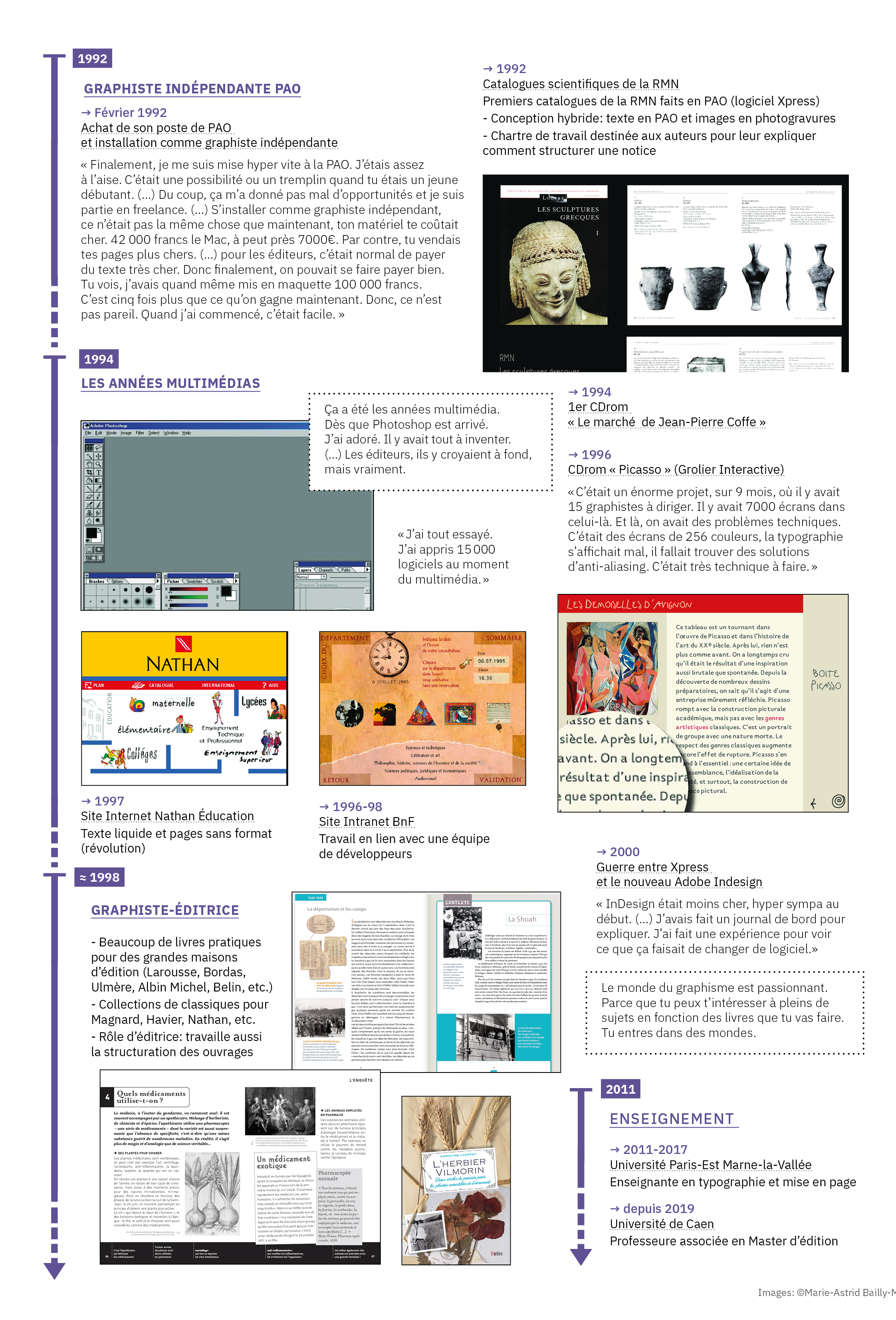 Cette annexe présente les parcours des designers graphiques avec qui nous nous sommes entretenus sous forme de « planches de vies ». Elles retracent des moments importants dans leur vie professionnelle (et parfois personnelle) sous forme chronologique. Nous avons divisé ces parcours en grandes périodes et disposé des projets ou évènements présentés comme importants ou signifiants par les designers graphiques eux·elles-mêmes lors des entretiens. Nous avons aussi accompagné ces planches de verbatim issus des entretiens. Notons que nous n’avons pas fait de planche pour Éloïsa Perez, Manu Vazquez et Alexandre Laumonier car nous n’avons pas récupéré suffisamment de données lors des entretiens.