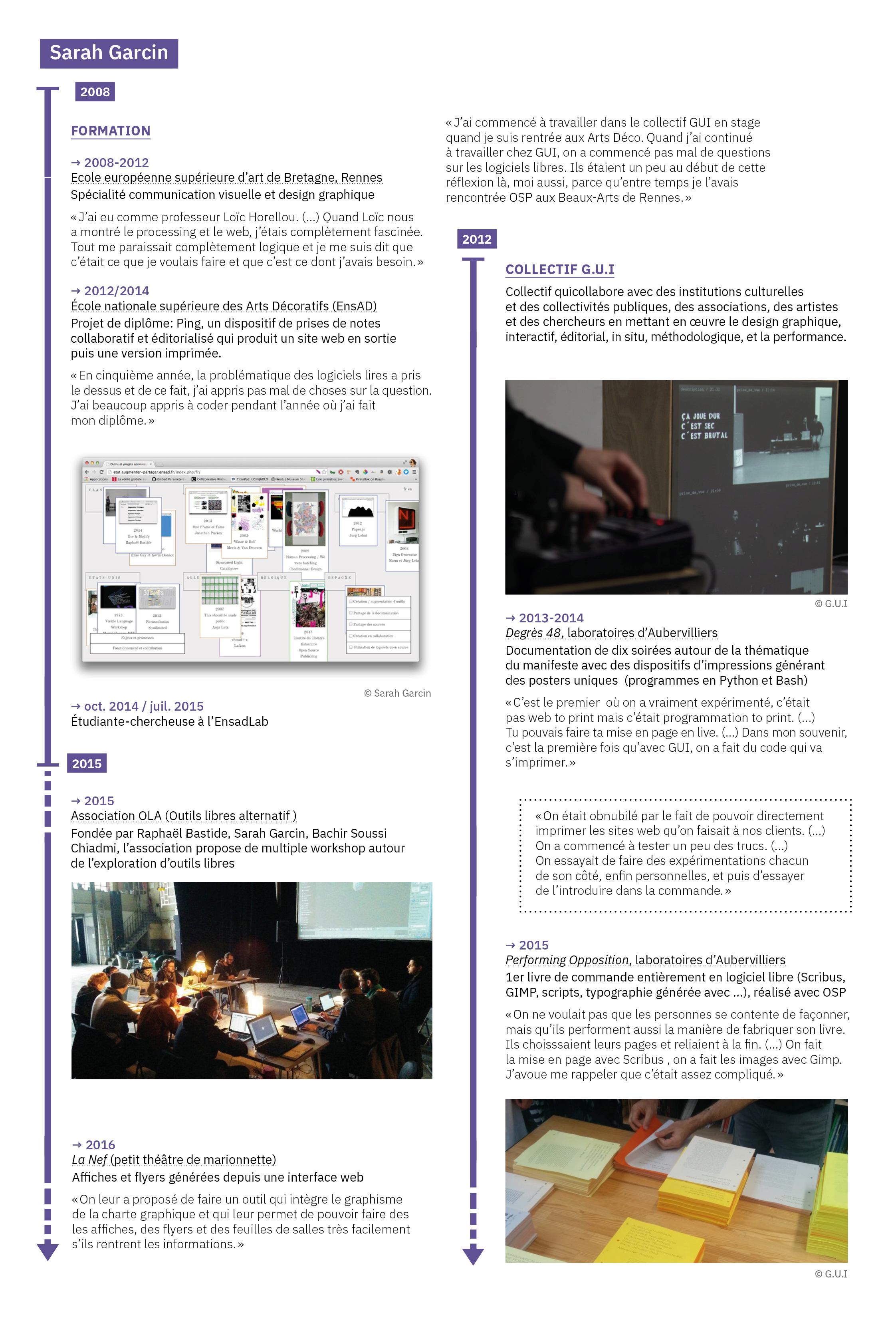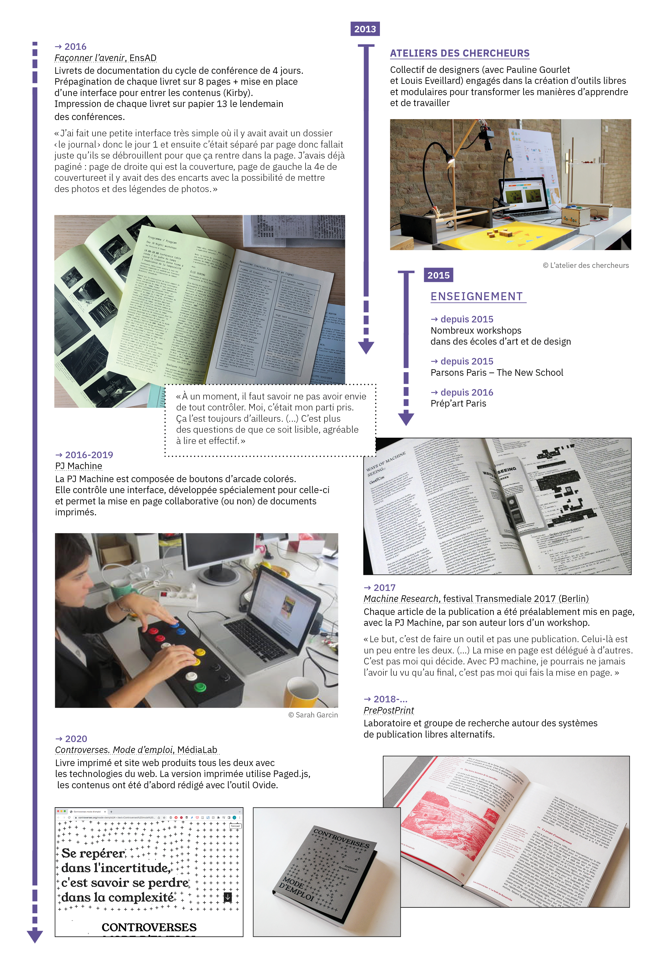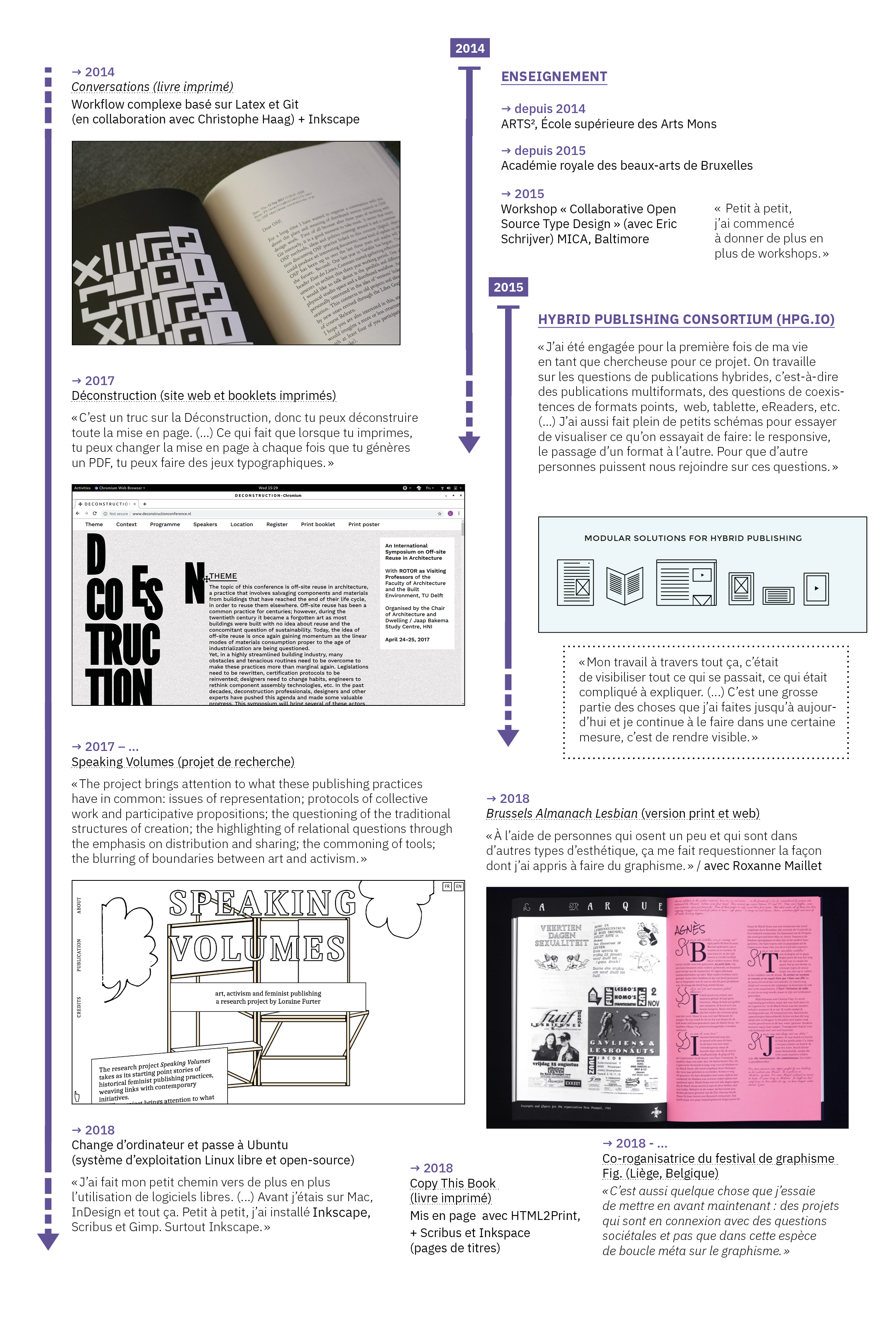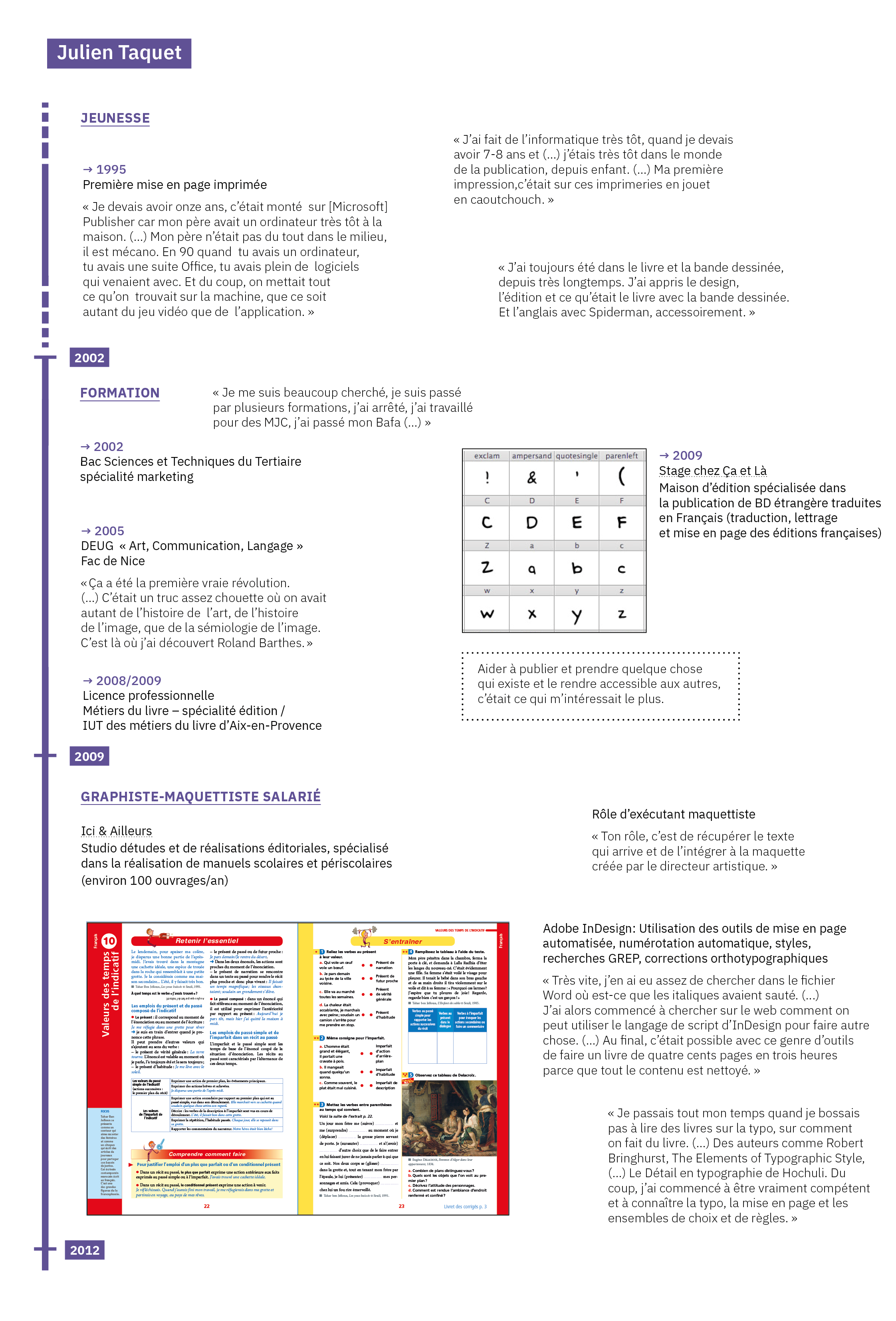 Cette annexe présente les parcours des designers graphiques avec qui nous nous sommes entretenus sous forme de « planches de vies ». Elles retracent des moments importants dans leur vie professionnelle (et parfois personnelle) sous forme chronologique. Nous avons divisé ces parcours en grandes périodes et disposé des projets ou évènements présentés comme importants ou signifiants par les designers graphiques eux·elles-mêmes lors des entretiens. Nous avons aussi accompagné ces planches de verbatim issus des entretiens. Notons que nous n’avons pas fait de planche pour Éloïsa Perez, Manu Vazquez et Alexandre Laumonier car nous n’avons pas récupéré suffisamment de données lors des entretiens.