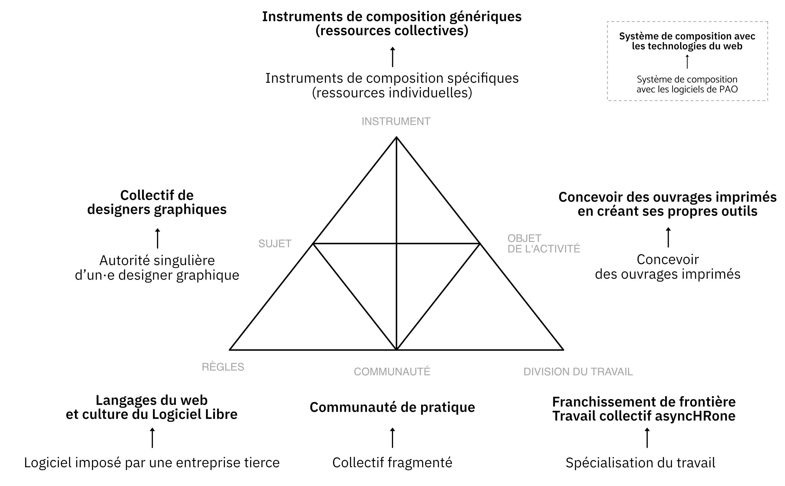 En nous basant sur les cadres de l’approche instrumentale et la théorie historico-culturelle de l’activité, nous avons été en mesure de problématiser ces nouvelles pratiques du point de vue de l’activité. Nous nous sommes alors demandé comment les designers graphiques élaborent les instruments de leur activité de composition avec les technologies du web et comment ils·elles participent de fait au développement de leur communauté de pratique. L’intrication de ces deux cadres conceptuels nous a permis d’analyser de manière fine l’activité à la fois au niveau individuel et au niveau collectif à travers un état de l’art puis trois études empiriques conçues de manière à appréhender l’activité de composition avec les technologies du web selon différents points de vue.