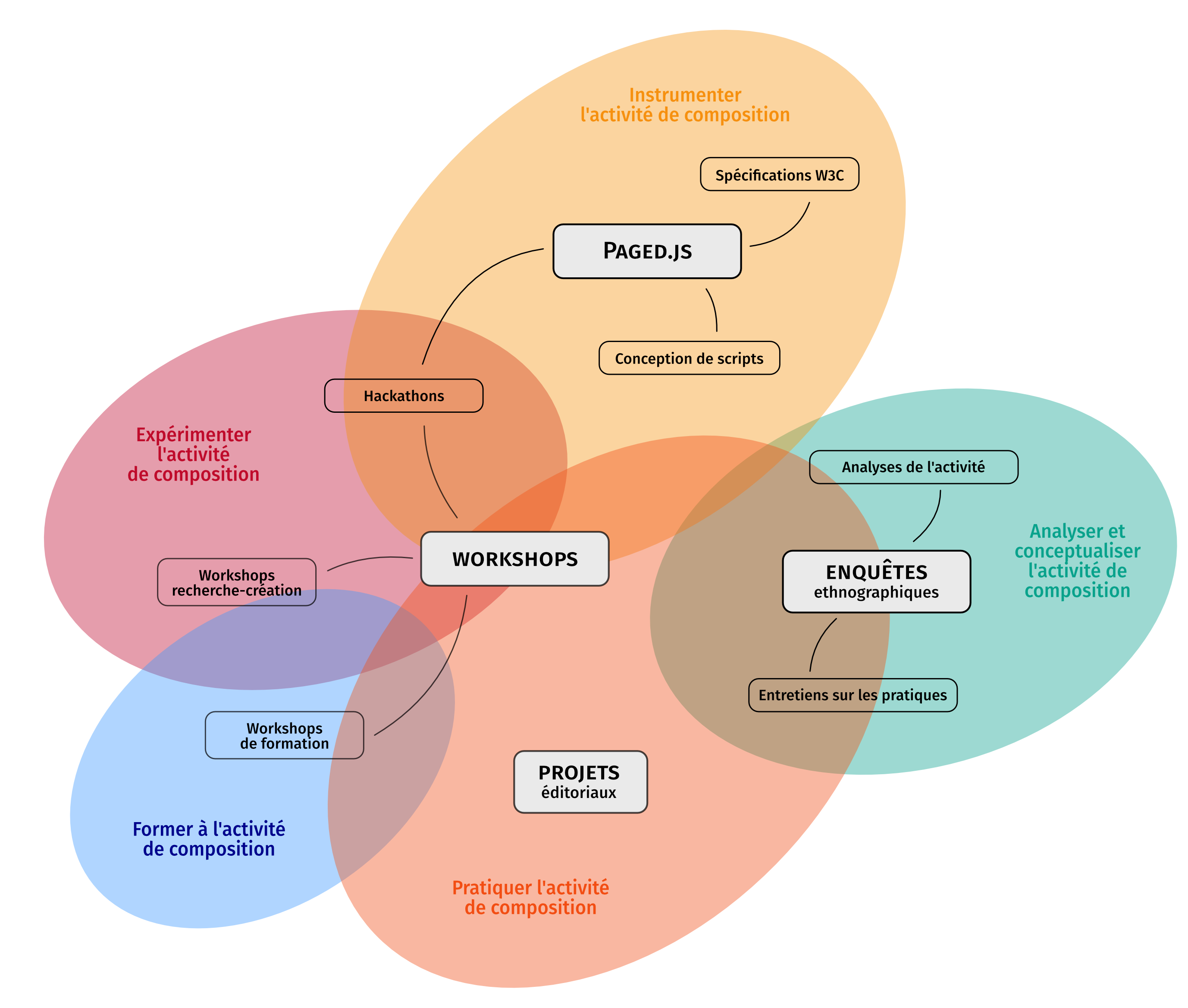 Les workshops sont une pratique courante dans le champ du design et particulièrement lors de la période de formation ou dans la recherche. Ils permettent un travail organisé dans des contraintes spatiales et temporelles définies et peuvent avoir différentes finalités : pédagogiques, expérimentales, développementales, productives, etc. Les workshops de formation sont adressés à des publics étudiants ou professionnels, ils visent la formation à l’activité de composition avec les technologies du web. Les workshops de recherche-création sont tournés vers une pratique plus expérimentale de l’utilisation de ces technologies ; le processus de création est orienté vers le faire artistique, ses dimensions formelles et esthétiques et la découverte d’outils inhabituels. Enfin, nous avons vu que les hackathons sont plus spécifiques au domaine de la programmation informatique ou de la création numérique. Dans notre cas, ils concernent des évènements dédiés à la conception et au développement de Paged.js