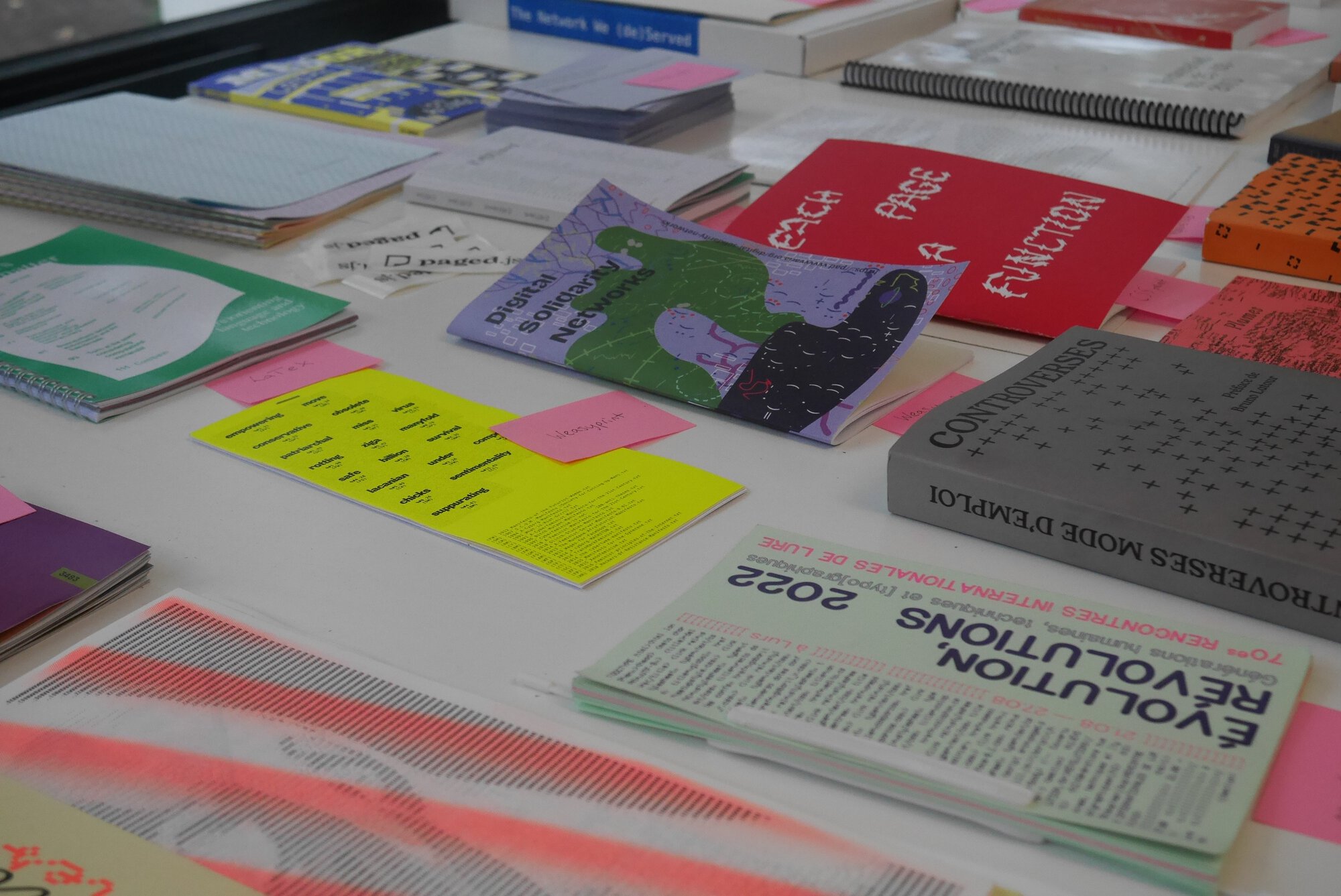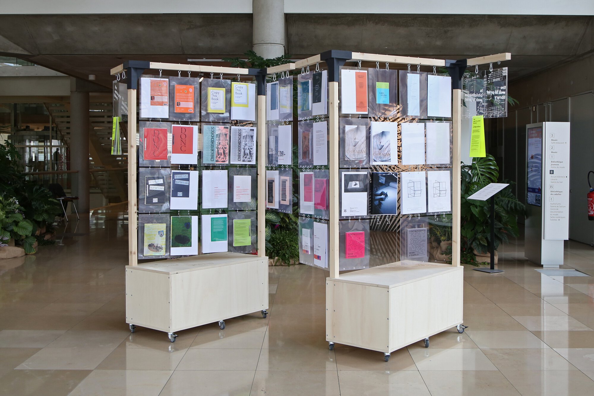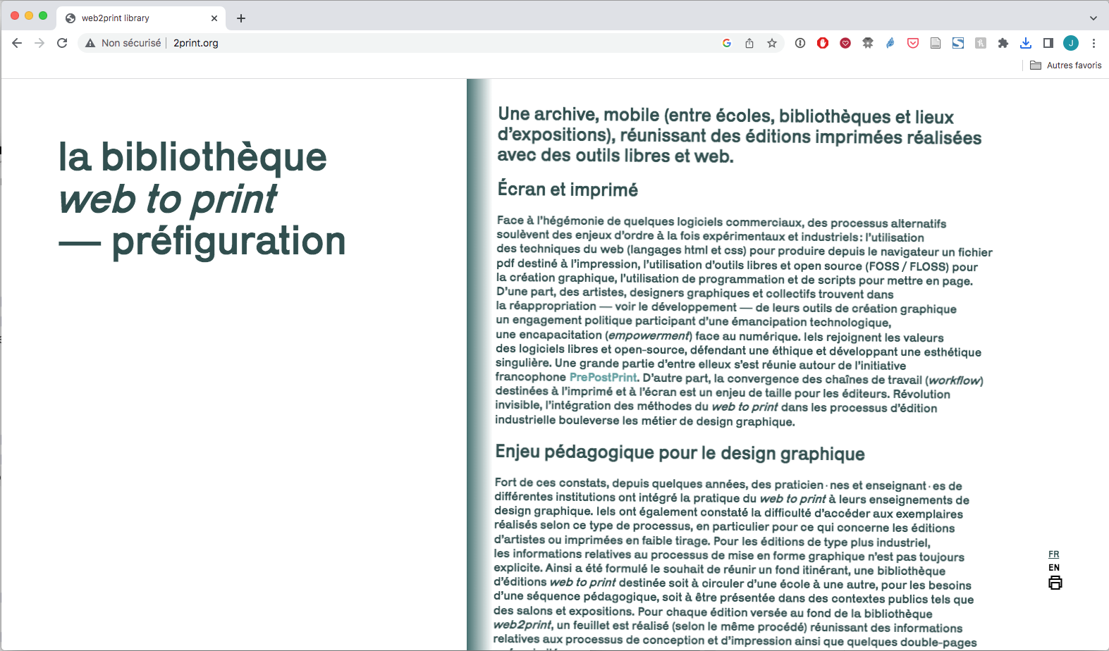 Notons aussi une initiative d’archivage portée par Lucile Haute et Quentin Juhel, la bibliothèque web to print, destinée à réunir des éditions produites avec les technologies du web ou des outils libres et open source14. Ce fonds itinérant vise à pallier la difficulté d’accéder aux exemplaires réalisés selon ce type de processus et est destiné soit à circuler d’une école à une autre pour les besoins d’une séquence pédagogique, soit à être présenté dans des contextes publics tels que des salons et expositions.