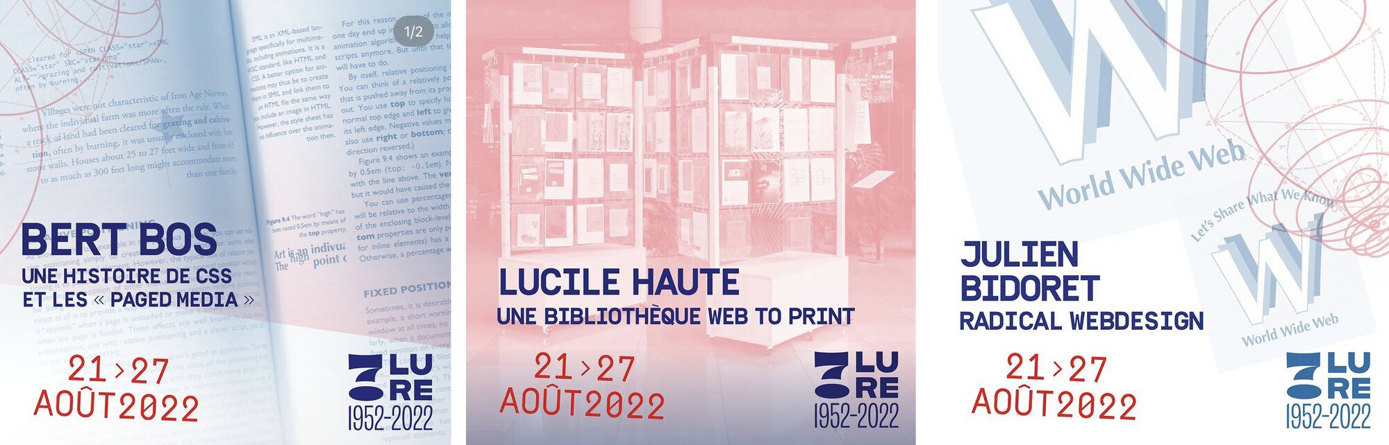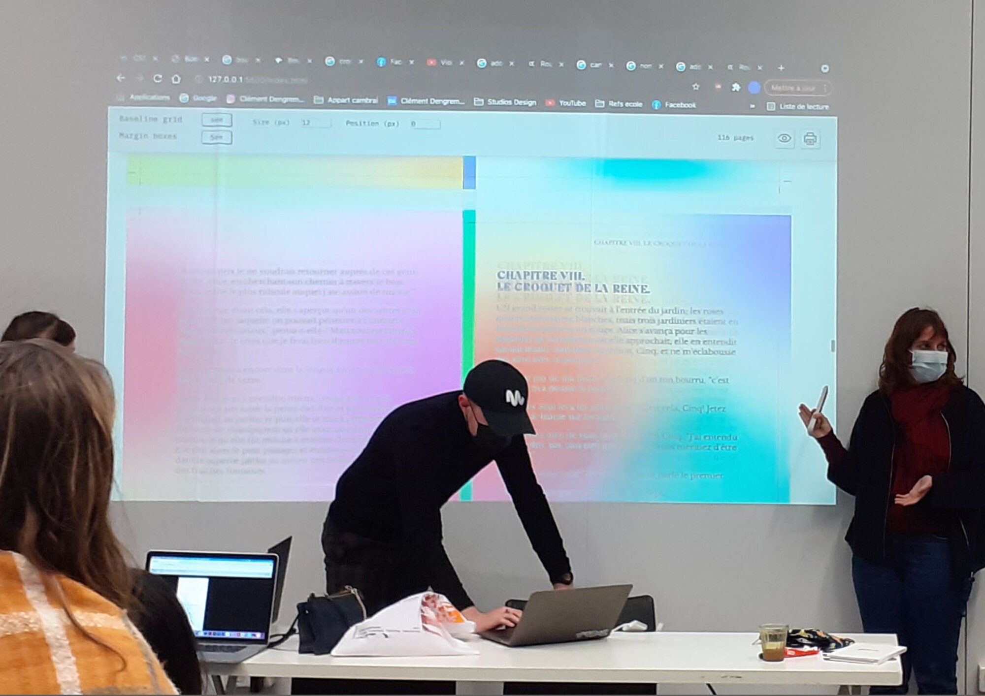 Aujourd’hui en France et notamment dans les écoles d’art et de design, l’utilisation de CSS pour l’impression trouve un écho dans des pratiques graphiques et artistiques pour ses possibilités d’expérimentations graphiques multimédias. Pour son projet de diplôme Rêve Party, Kiara Jouhanneau a ainsi utilisé les technologies du Web pour mélanger interactions à l’écran, fontes variables animées et jeux d’impression1. Pour un workshop consacré à Élisée Reclus, Julien Bidoret a proposé d’intervenir de manière interactive dans des fanzines ensuite imprimés2. Un système de webcam connecté en direct permettait de prendre des photos disposées en fond de page. De manière plus générale, les améliorations récentes de CSS (grilles, boîtes flexibles, dégradés, rotations, transformations et animations, SVG, fontes variables, modes de fusion, etc.) et les processus génératifs rendent les technologies du web de plus en plus attrayantes pour les expérimentations graphiques. Nous pouvons en trouver des exemples dans les travaux publiés à l’occasion de divers workshops que nous avons menés auprès d’étudiant·e·s à l’École supérieure d’art et de design d’Orléans3, l’École nationale supérieure des Arts Décoratifs4, l’École supérieure d’art et de communication de Cambrai5 ou plus récemment au Piet Zwart Institute de Rotterdam.