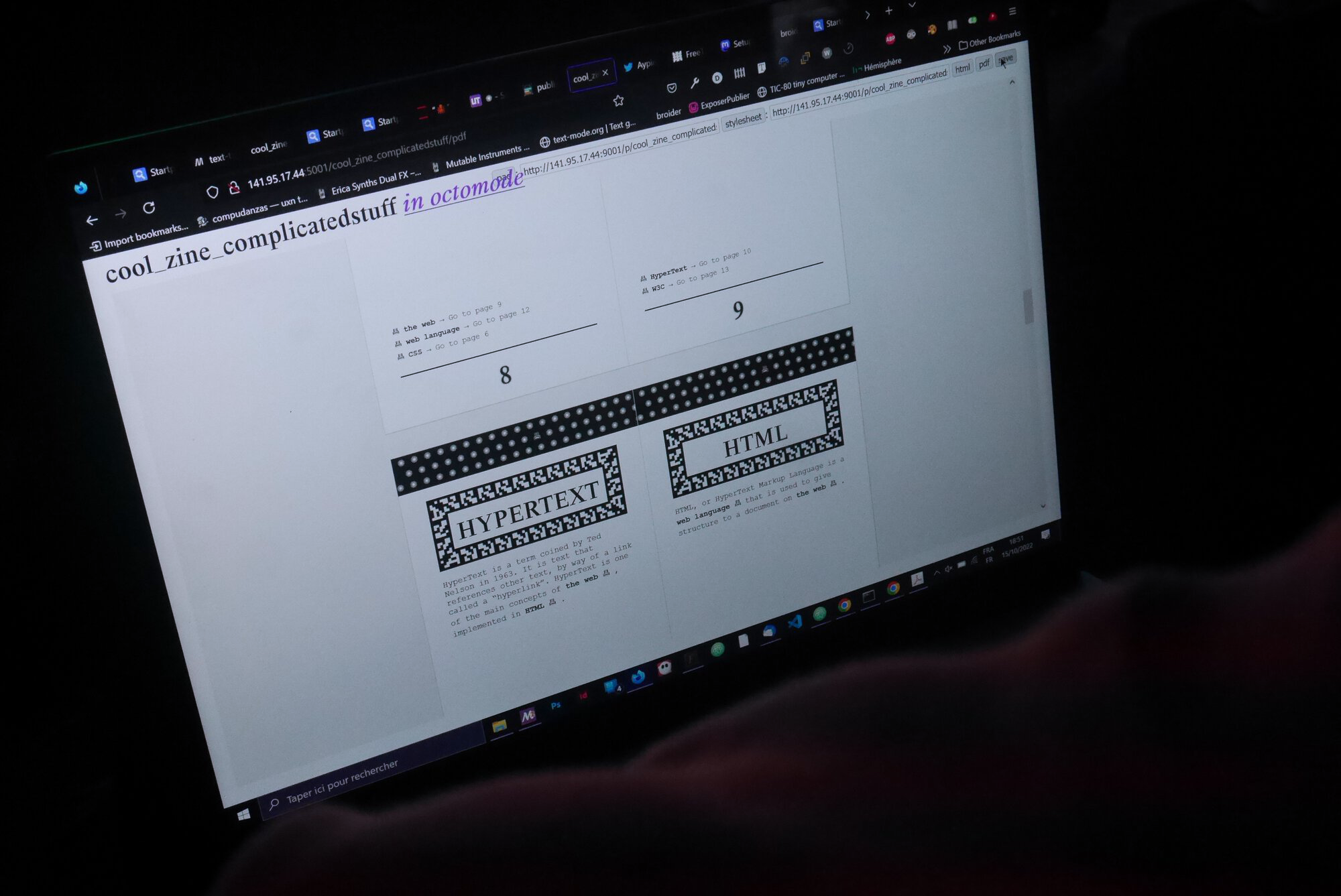 Les bénéfices de l’utilisation des technologies du web pour la pédagogie sont ainsi multiples : relative autonomie d’apprentissage, souveraineté technique et économique, liberté de création, etc. Quelques enseignant·e·s travaillent à porter cette vision dans les écoles d’art et de design. En France, citons Julien Bidoret à l’École supérieure d’art et de design des Pyrénées et Quentin Juhel à l’École Supérieure d’Art et de Design Grenoble – Valence. En Belgique, nous retrouvons beaucoup de membres d’Open Source Publishing dans les équipes enseignantes. Aux Pays-Bas, le master Experimental Publishing de la Piet Zwart Institute travaille aussi sur ces questions.