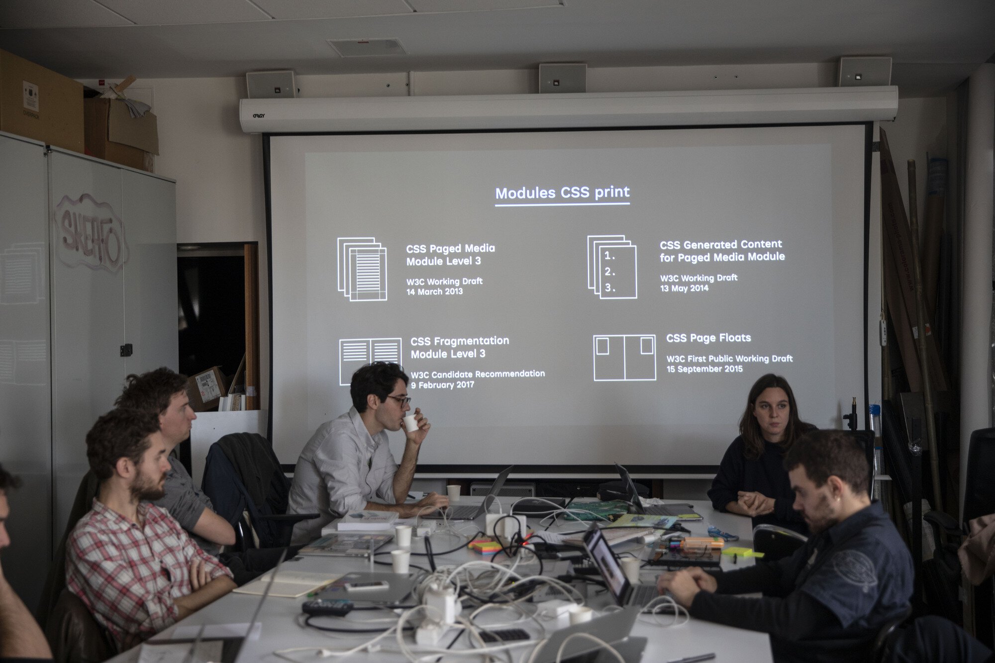 Le 9 janvier 2018, dans les bureaux de MIT Press à Cambridge aux États-unis, se réunissent un ensemble d’acteur·rice·s du monde de l’édition et du web intéressé·e·s par l’utilisation des technologies du web pour l’impression et la mise en page automatisée. L’évènement, à l’initiative d’Adam Hyde, co-fondateur de la Collaborative Knowledge Foundation (Coko), a pour but de partager les diverses expériences des personnes présentes3. Il marque surtout le départ d’une initiative collaborative pour le développement d’une approche technique libre et open source basée sur les standards du web écrits par le World Wide Web Consortium (W3C). Quelques semaines plus tard, le 23 mars 20184 est publiée une première version de Paged.js, une librairie JavaScript libre et open-source qui permet l’export de PDF et l’affichage paginé dans le(s) navigateur(s) à partir des technologies du web.