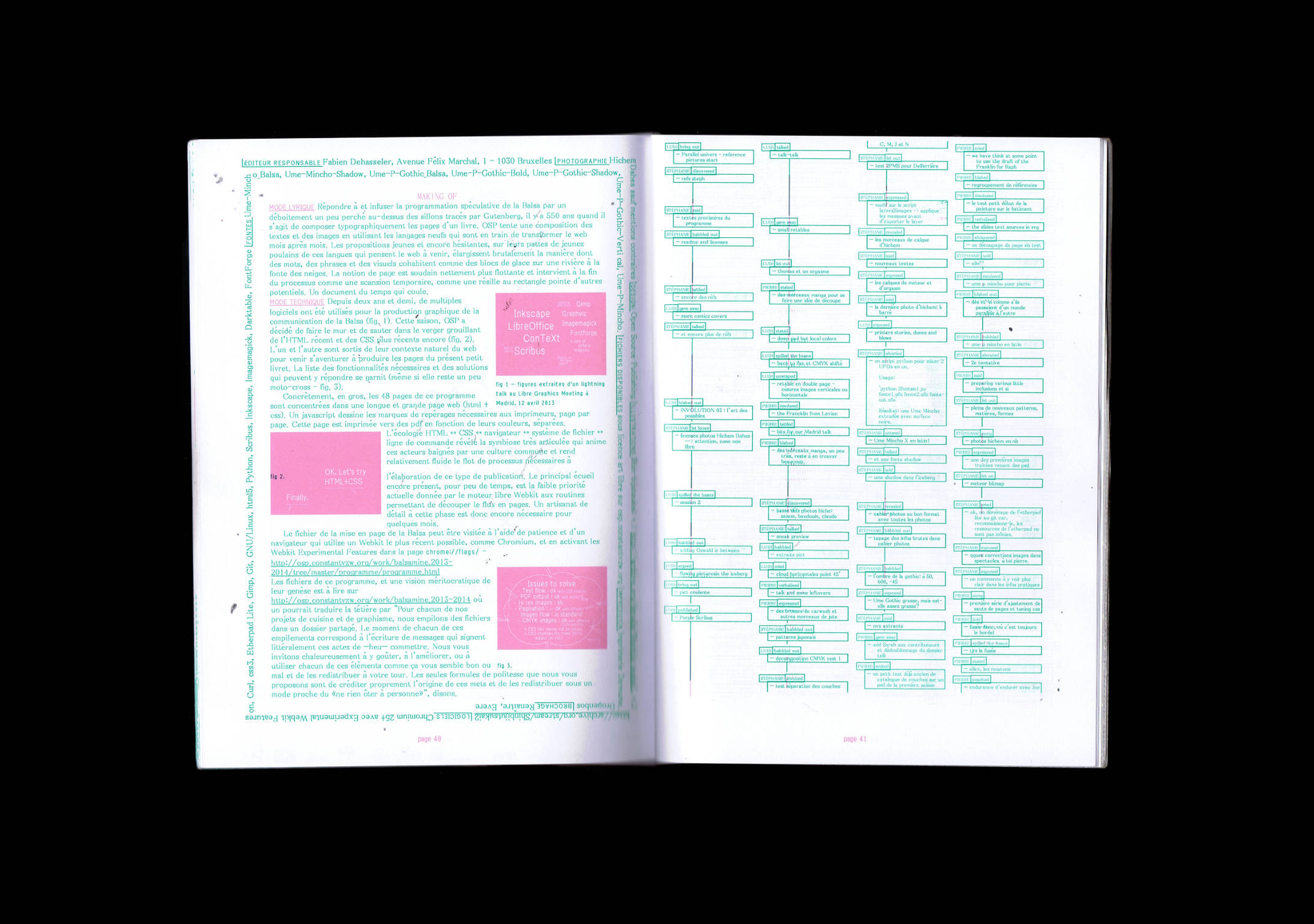 Or, depuis une dizaine d’années, l’utilisation du code dans les pratiques du design graphique, et particulièrement dans le web et l’impression, fait l’objet d’un intérêt toujours plus grand8. Les processus de programmation offriraient en effet des possibilités inédites d’articulation de différents médias, de génération de formes créatives et d’expérimentations graphiques et performatives diverses. Mais c’est particulièrement auprès d’une petite communauté de designers graphiques concernés par la relation à leurs outils et leurs valeurs culturelles intrinsèques que l’utilisation des technologies du web pour l’impression trouve un fort écho9. Ces designers graphiques – situés majoritairement en France, en Belgique et aux Pays-Bas – adoptent en effet ces technologies pour s’inscrire dans une lutte contre le monopole du logiciel à interface graphique Adobe InDesign, outil hégémonique dans la profession pour la conception de documents imprimés, mais posant des problèmes sociétaux et éthiques.