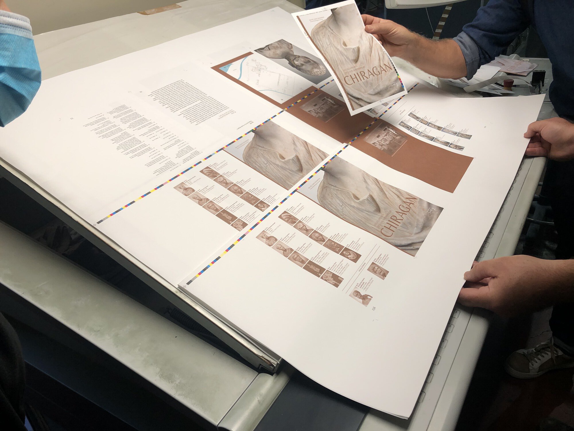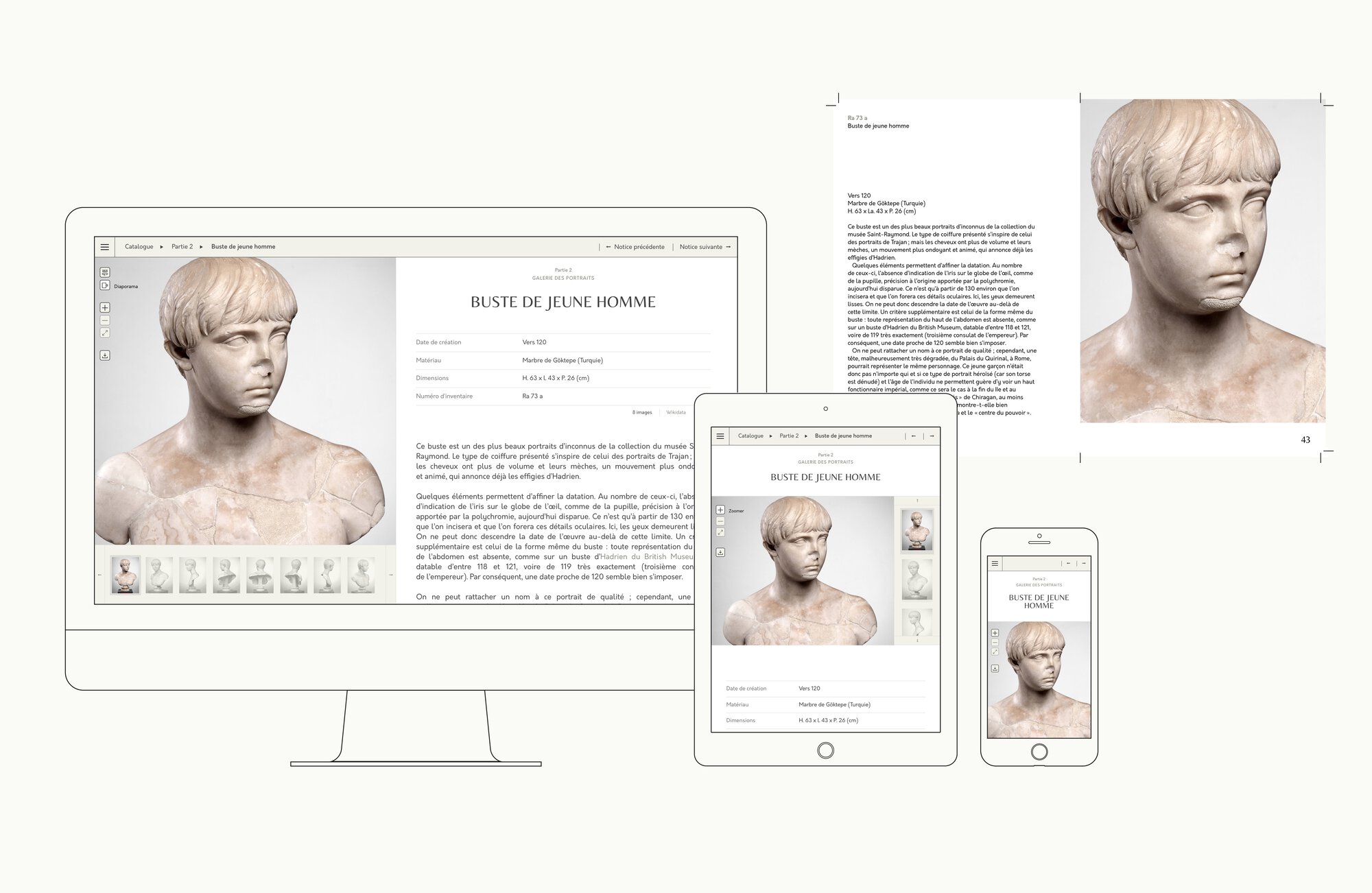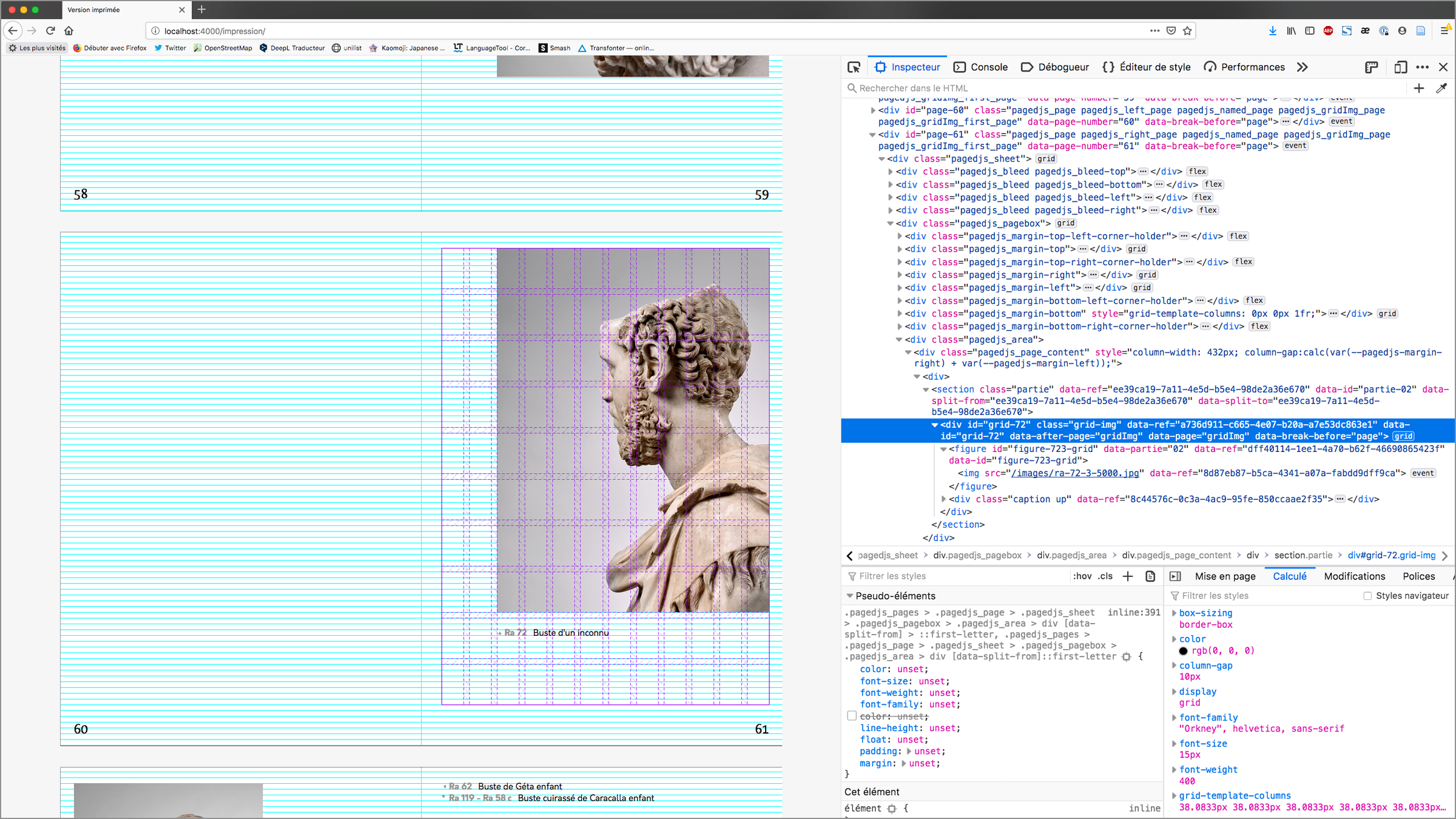 Parallèlement, dans les derniers mois de l’année 2018 et les premiers mois de l’année 2019, Antoine Fauchié et moi-même travaillons avec l’équipe du musée Saint Raymond de Toulouse à la conception et au développement d’une publication multisupport composée d’un catalogue imprimé et d’un catalogue numérique (sous forme de site web). La chaîne de publication de cette double publication repose sur l’utilisation d’outils open source et collaboratifs et particulièrement sur les technologies du web et ses standards – à la fois pour l’écriture, l’édition, la composition et la diffusion des catalogues6. Ainsi, la version imprimée du catalogue, issue des mêmes contenus que ceux du site web, est la première publication imprimée en offset composée et mise en page avec Paged.js.